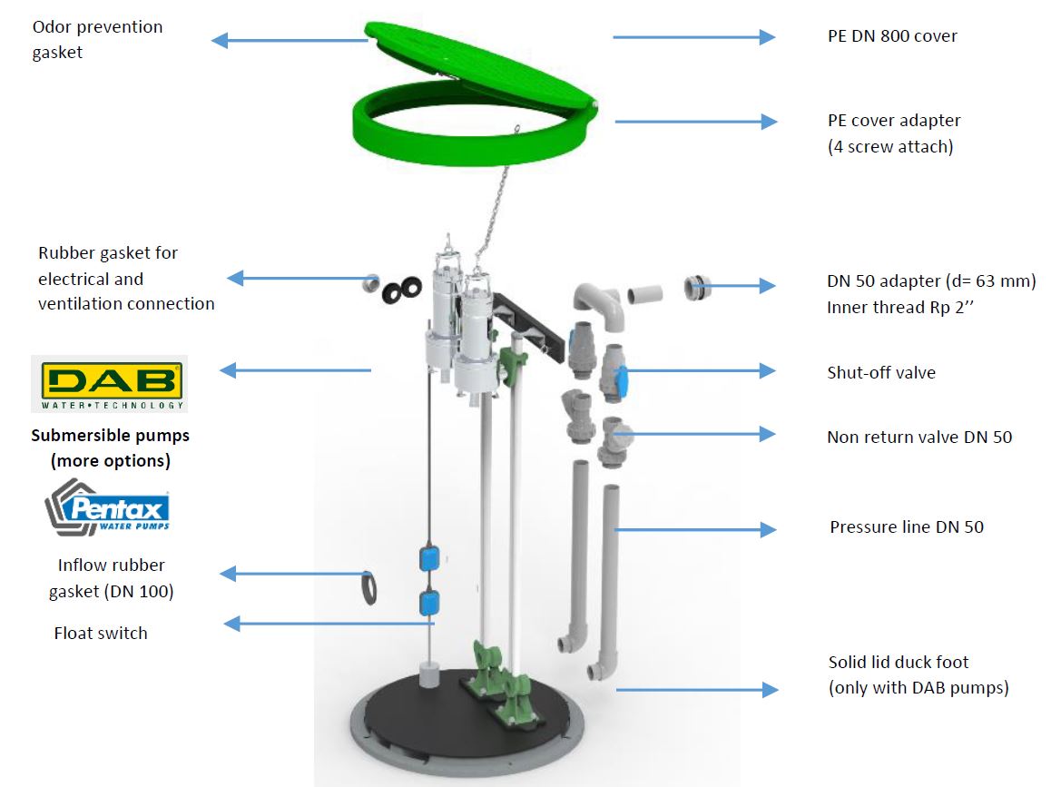 Pumping stations of diameter DN800 with two submersible pumps installed are intended for pumping faecal or meteor water, with the possibility of pumping up to 9 m in height. Pumping station consist of nature-friendly (polyethylene) shaft, a submersible pumps and other carefully selected components.