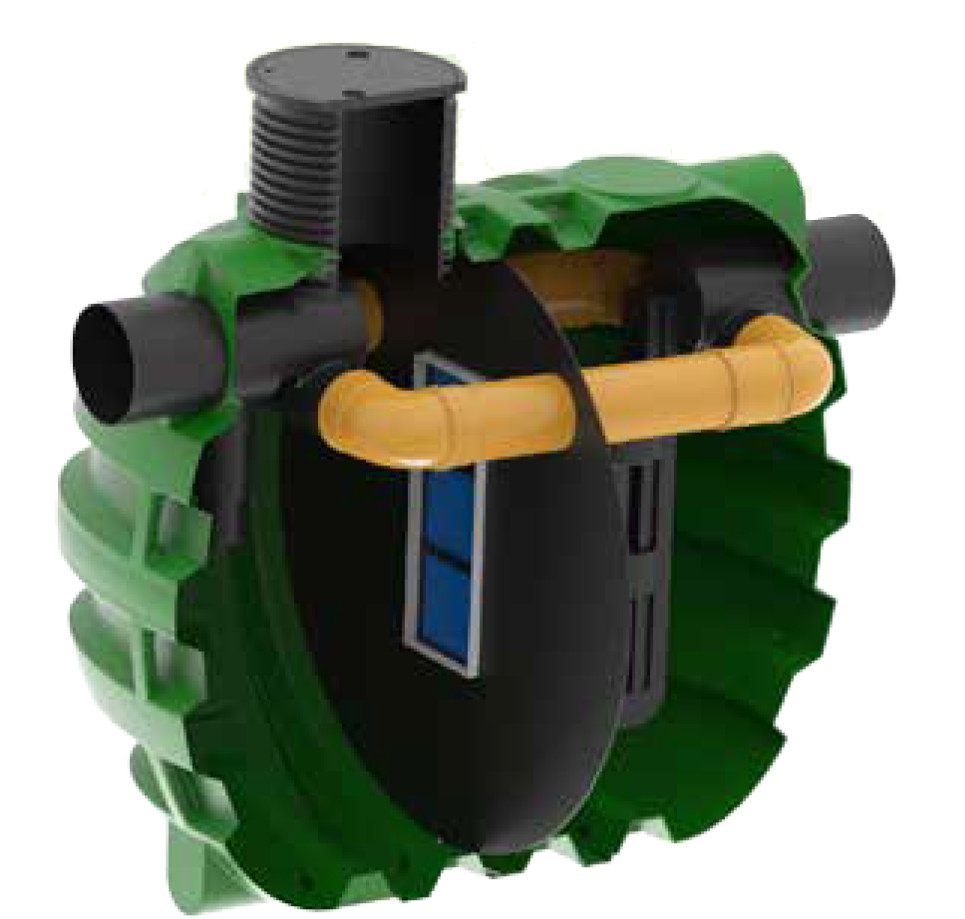 Selon la région, la surface à traiter et les autorisations locales, il peut être accepté qu’une partie de l’eau à traiter ne soit pas dirigée vers le séparateur. En cas de fortes précipitations, le by-pass (dispositif de dérivation) permet, une fois que le débit du séparateur est atteint, de faire passer le reste de l’eau en direct.