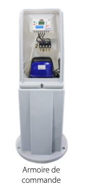 - d’une armoire de commande étanche en béton contenant l’unité de commande électronique et le compresseur.
