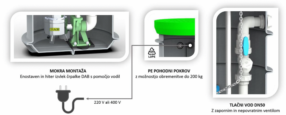 Črpalke RoPump s premerom DN600 so namenjene črpanju fekalne ali meteorne vode z možnostjo črpanja do 8 m višine. Sestavljeni so iz naravi prijazne posode, potopne črpalke in drugih skrbno izbranih nameščenih komponent.